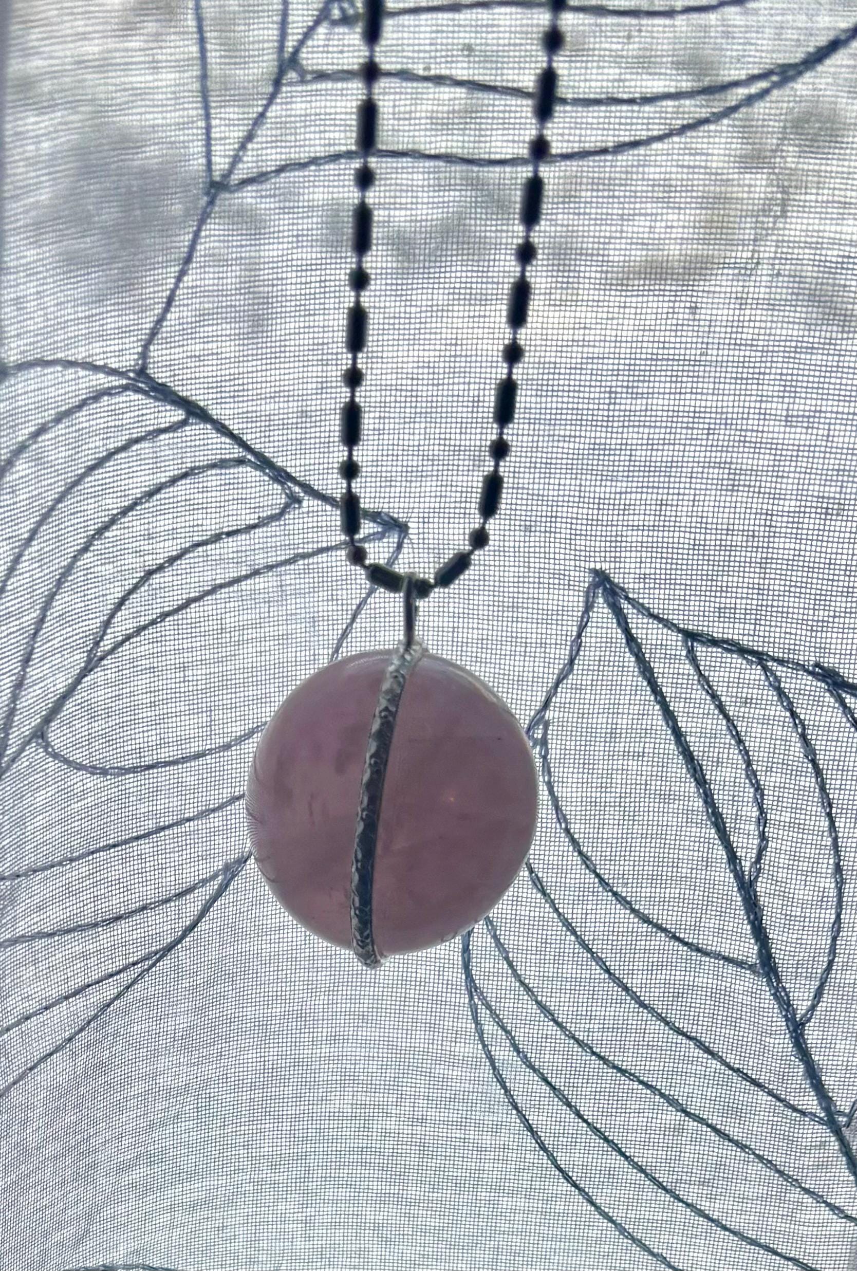 Handmade pendant is unique no two alike as these are natural Quartz rock crystal cut into spheres. Some are darker pink while others are very light pink.