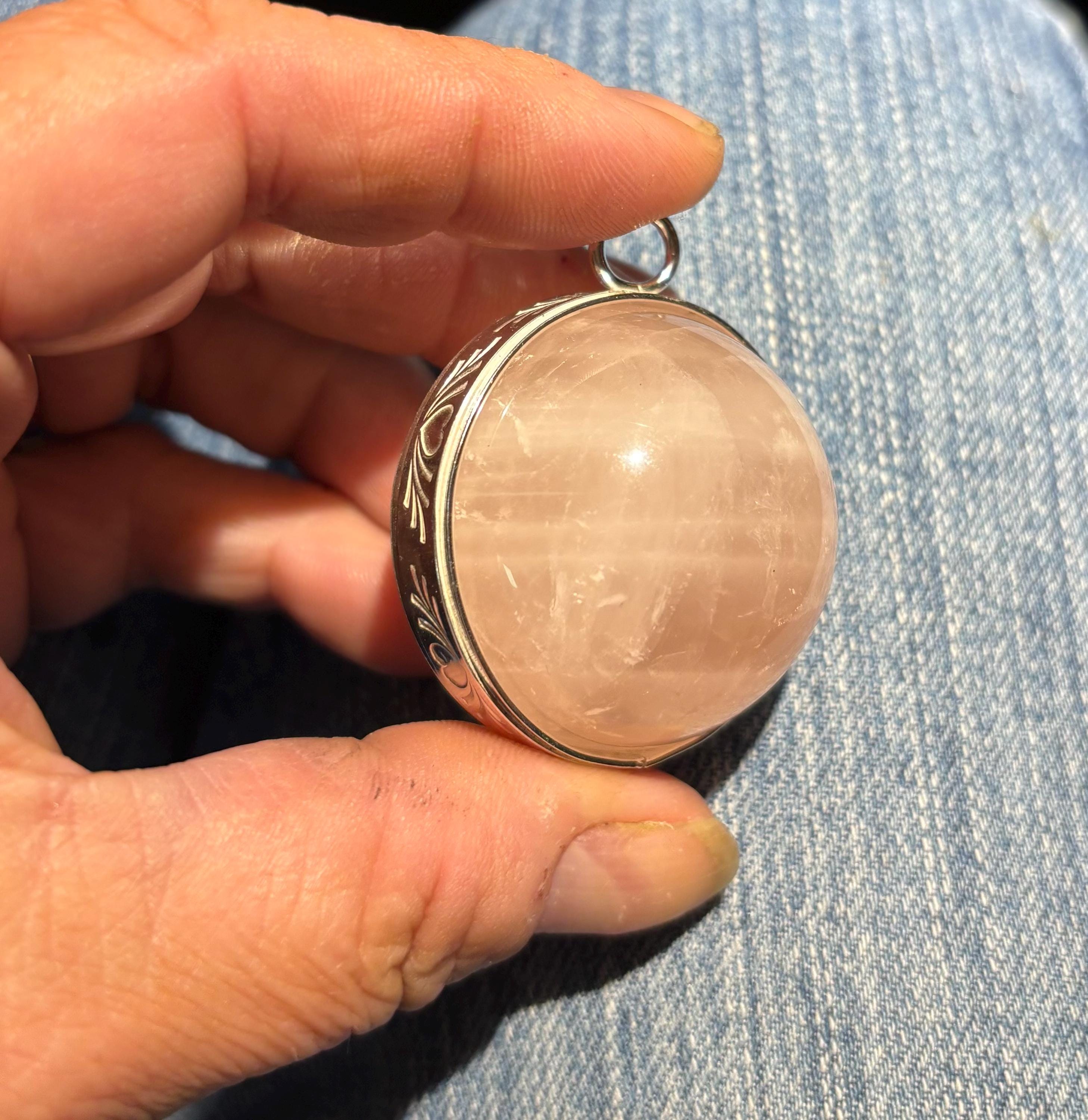 This is my largest Sphere Pendant 30- 35mm round Jelly Pink Rose Quartz Sphere Gemstone Necklace. I have 8 other light pink rose quartz orbs genuine earth mine crystal if you prefer shown unmounted.