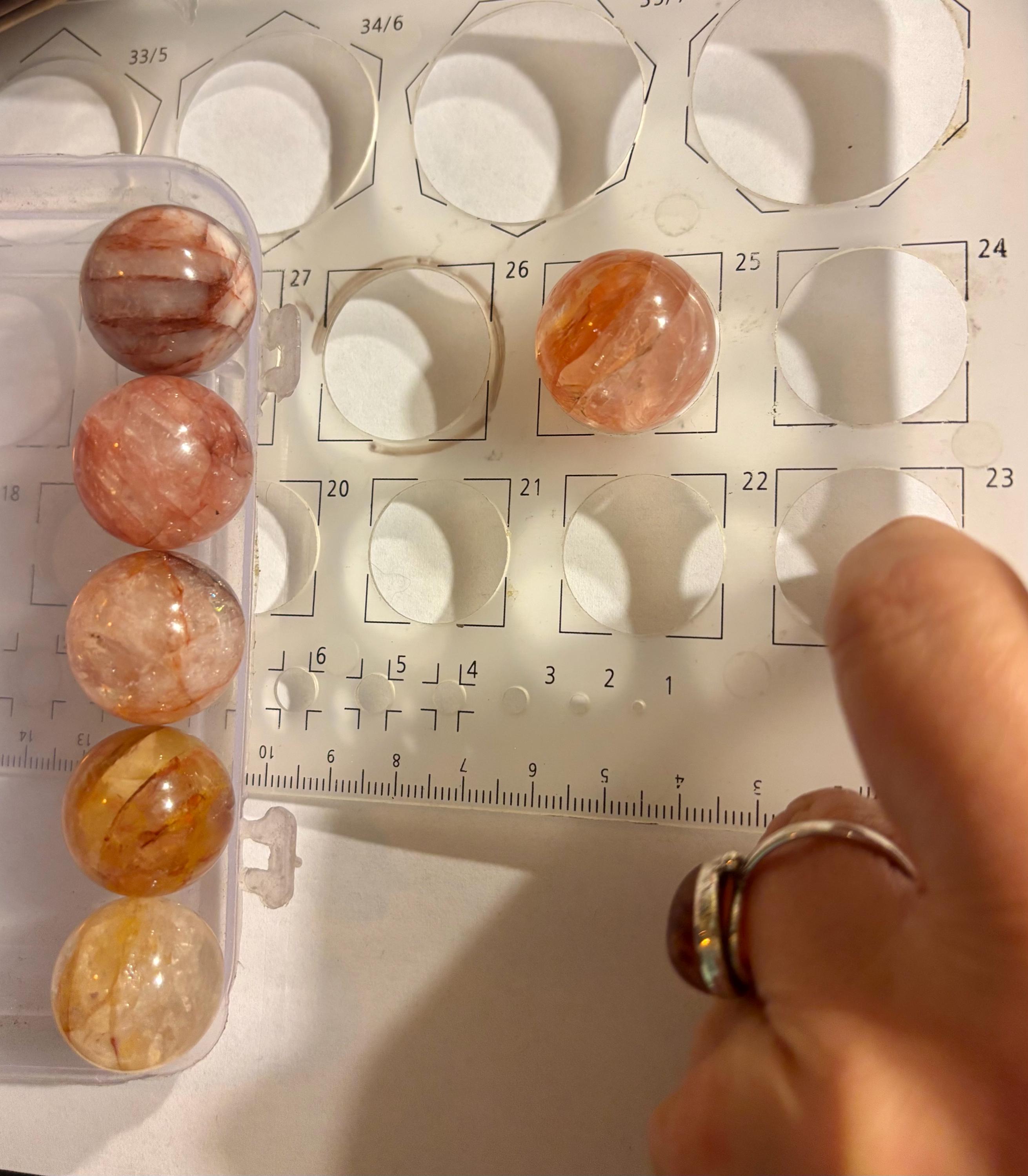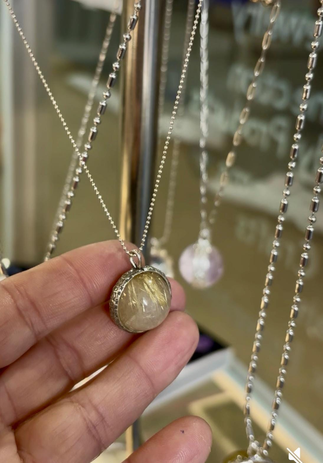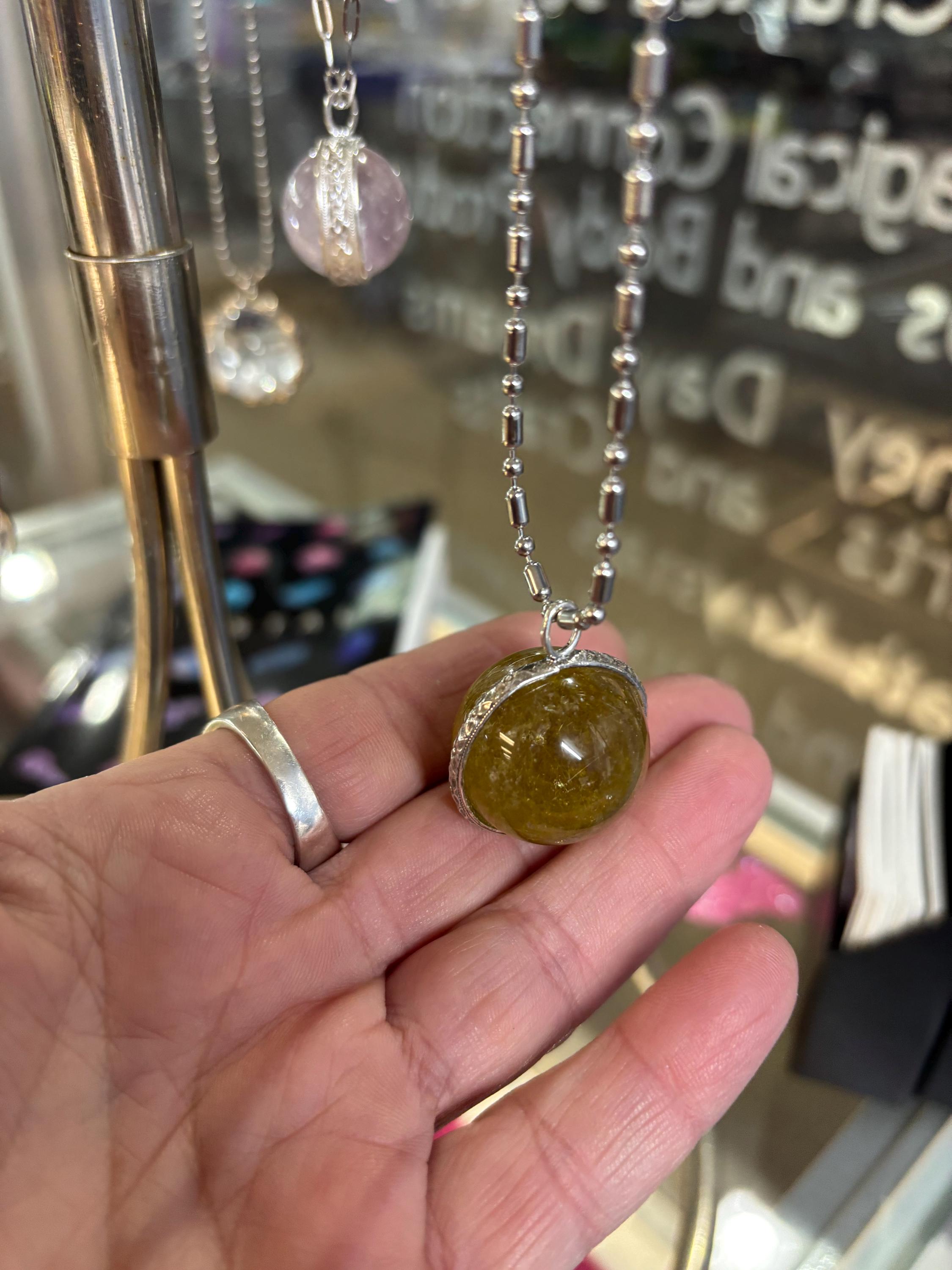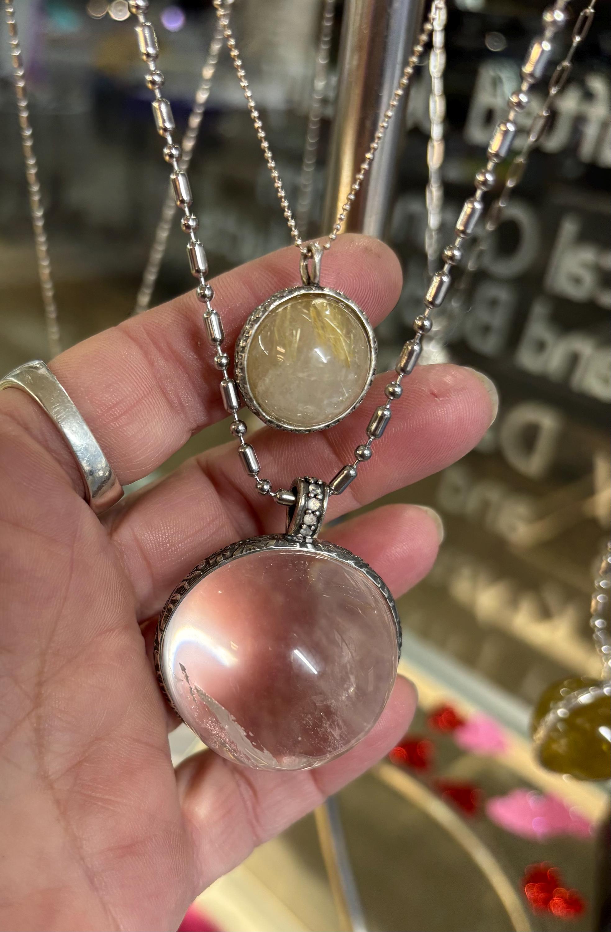 Handmade pendant is unique no two exactly alike as these are natural Quartz rock crystal cut into spheres. Some are clear while others have lots of inclusions or “stuff” inside.