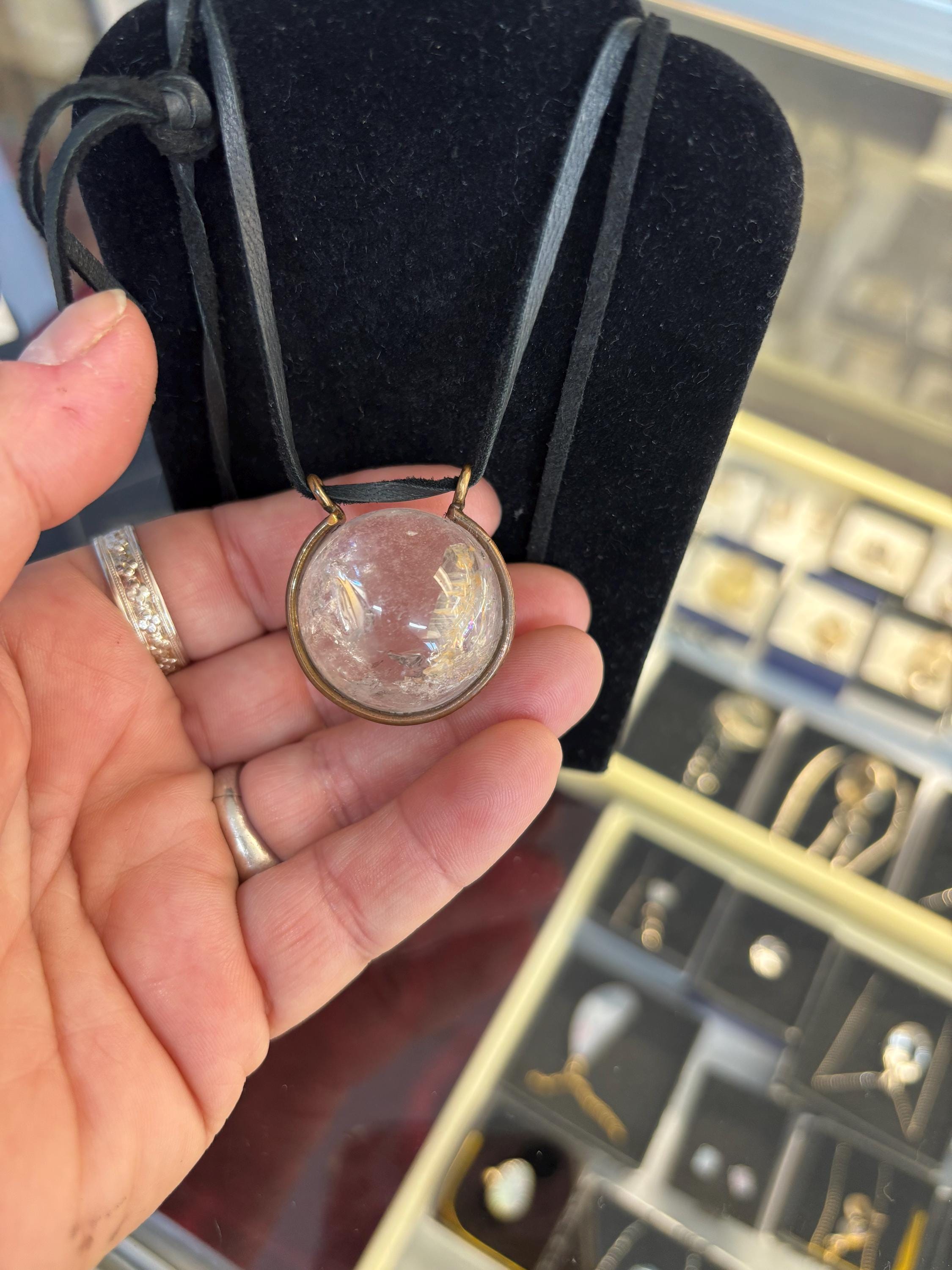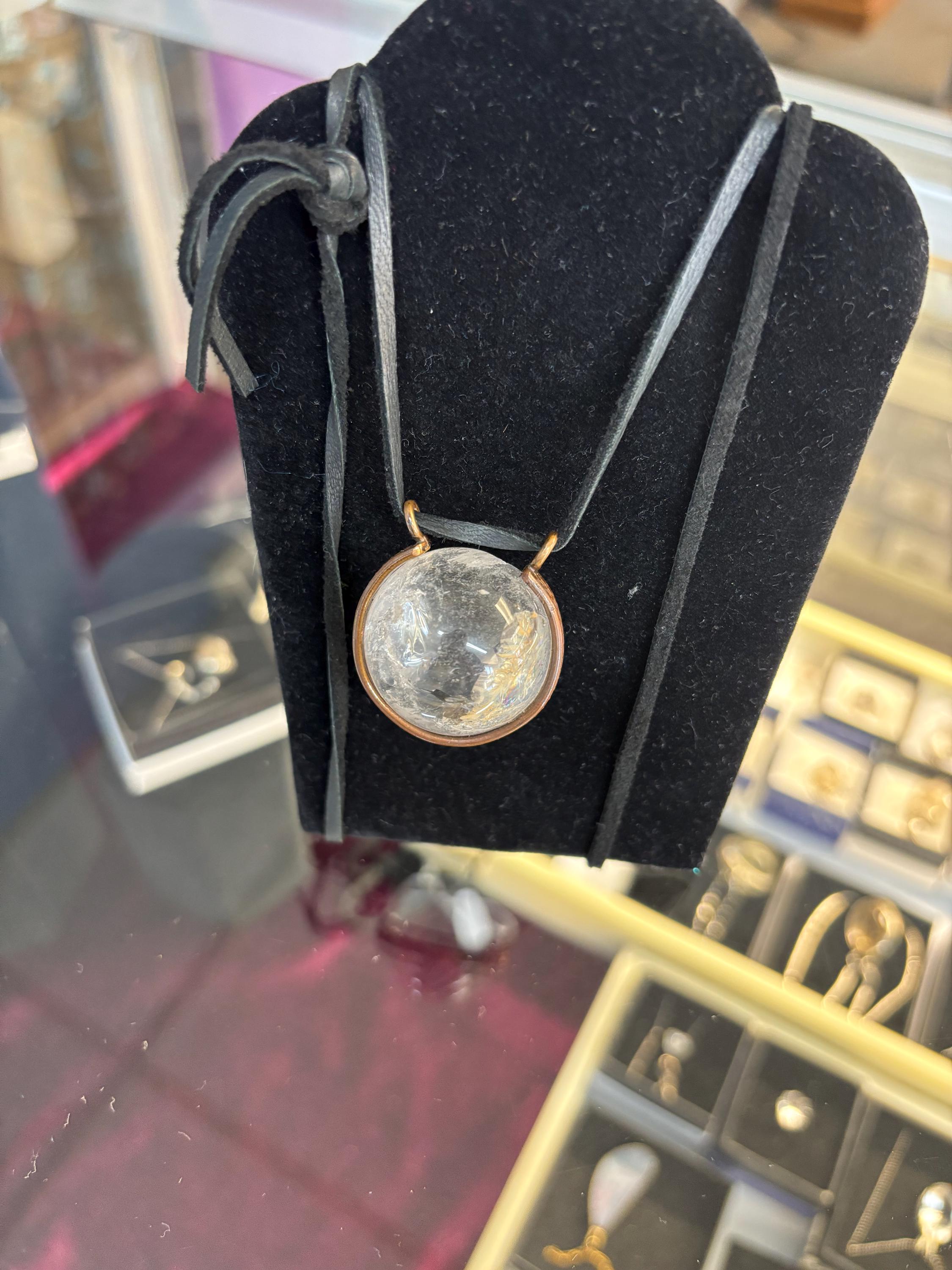 Handmade pendant is unique no two alike as these are natural Quartz rock crystal cut into spheres. Some are clear while others have lots of inclusions or “stuff” inside.