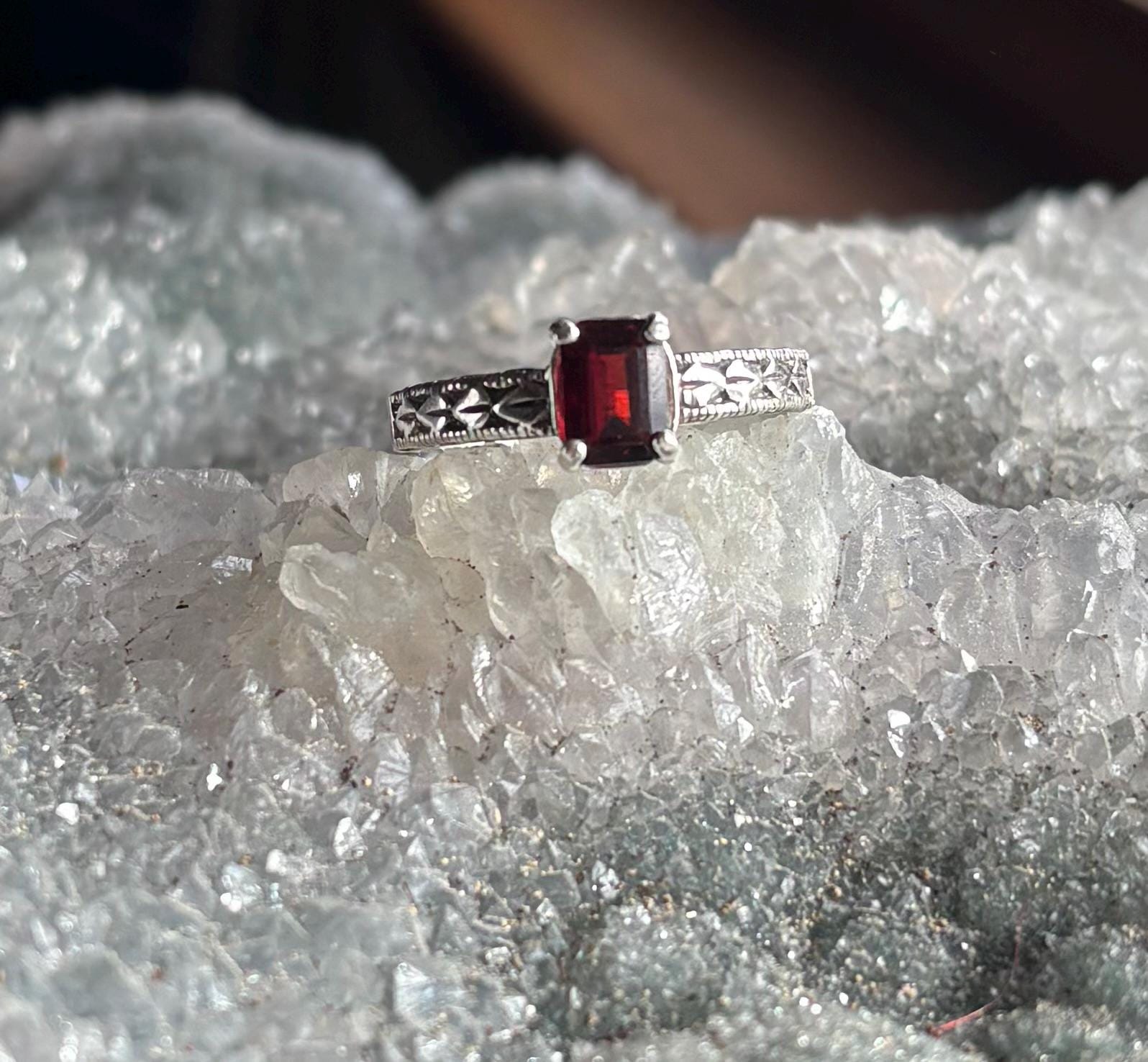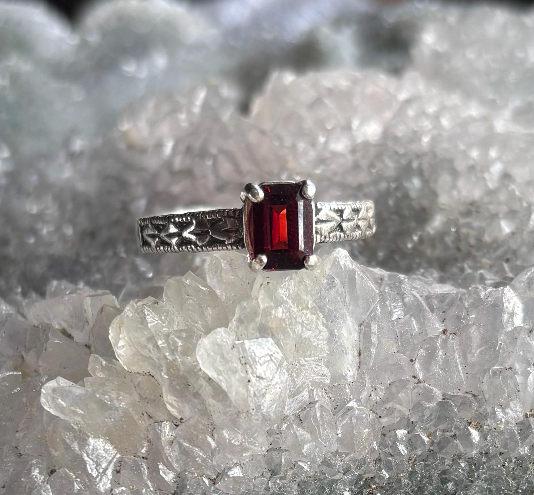 Love the Deep Red in this Garnet Gemstone. 7x5mm Emerald cut Garnet is the birthstone for January. This beauty is set in a heavy sterling silver patterned band thick enough to stand the test of time. Ring has been antiqued to bring out the leaf detailing. Ring can also be left bright and shiny if you wish with no antiqued areas. Just leave me a note in the message to seller box with your choice when ordering.