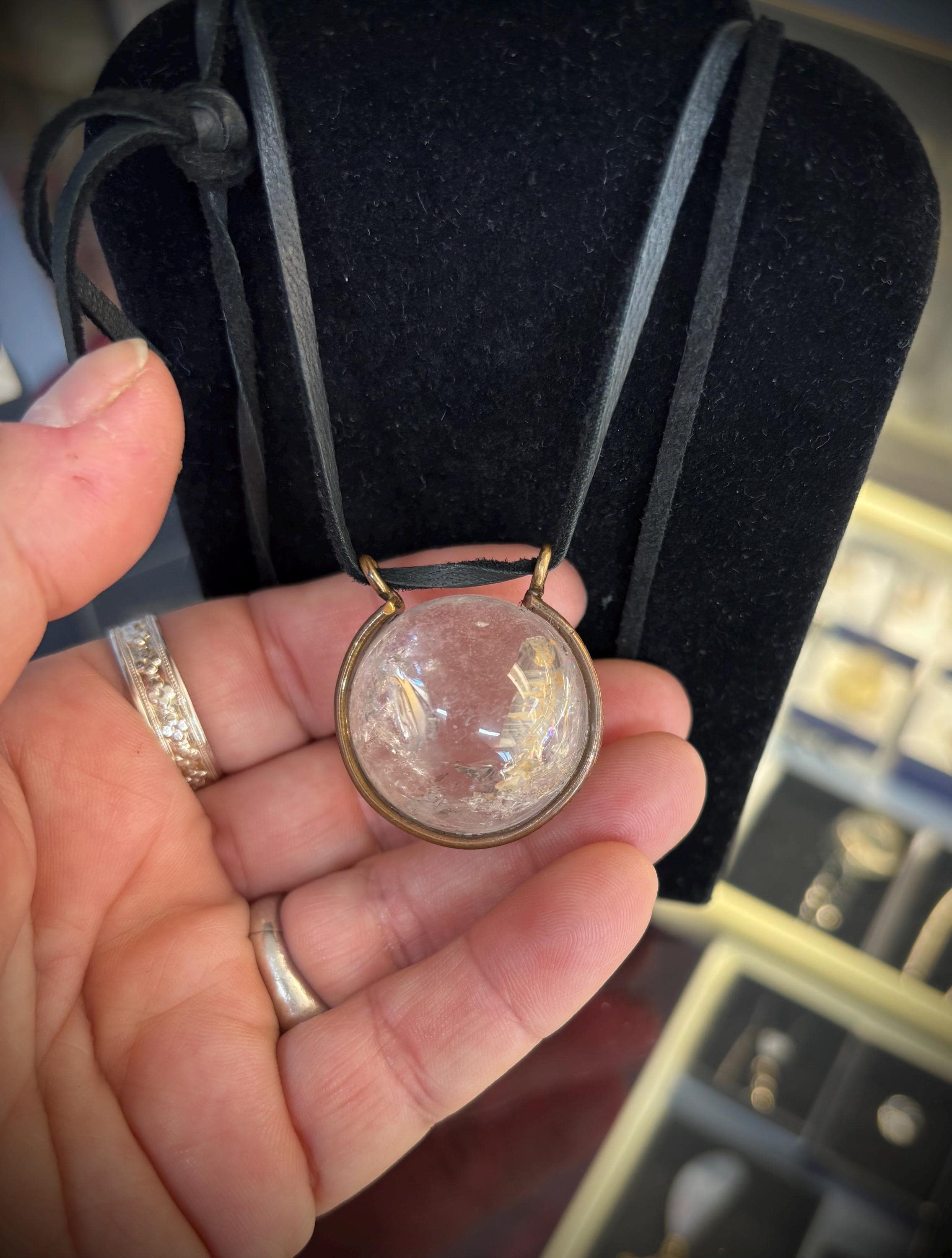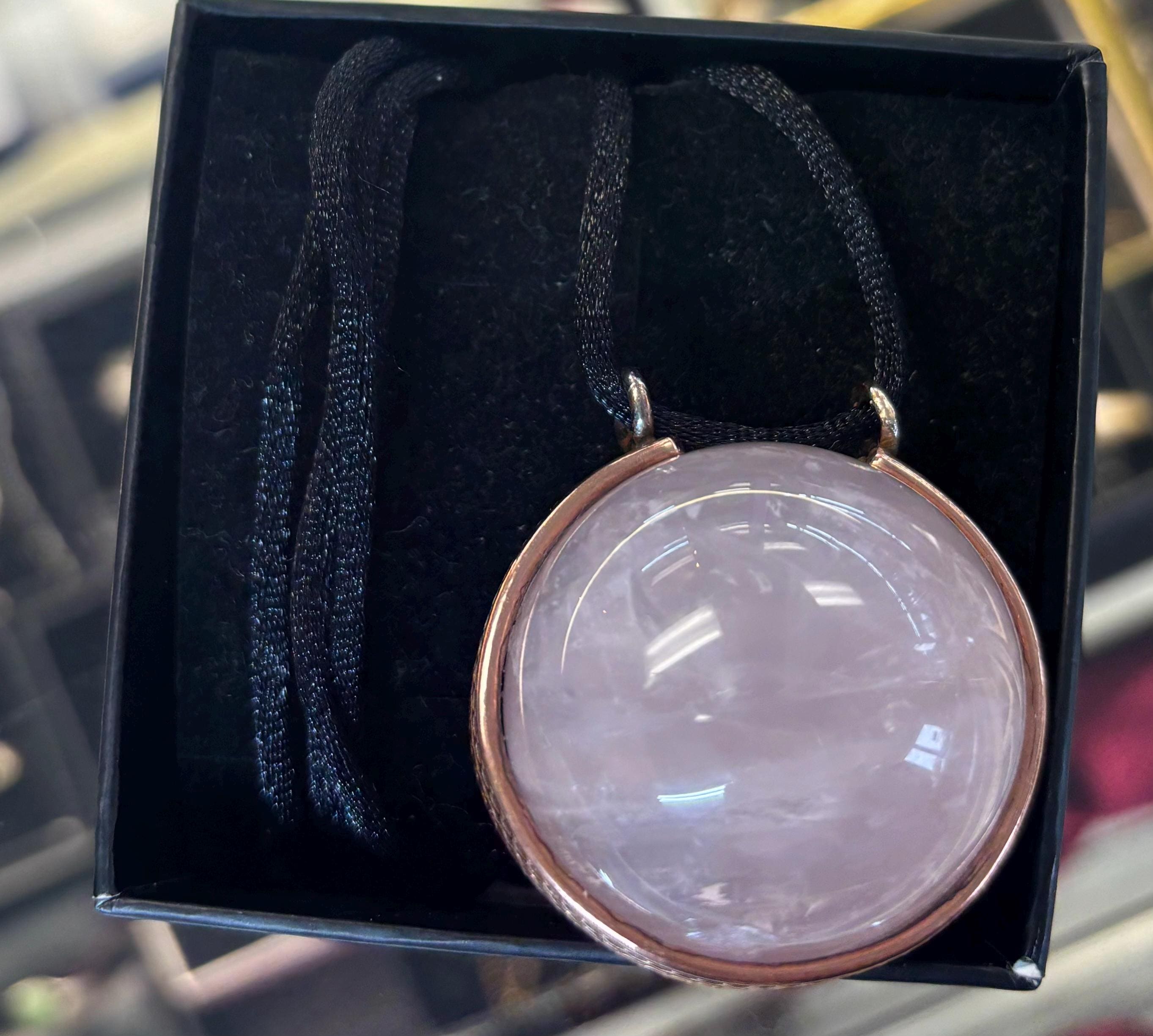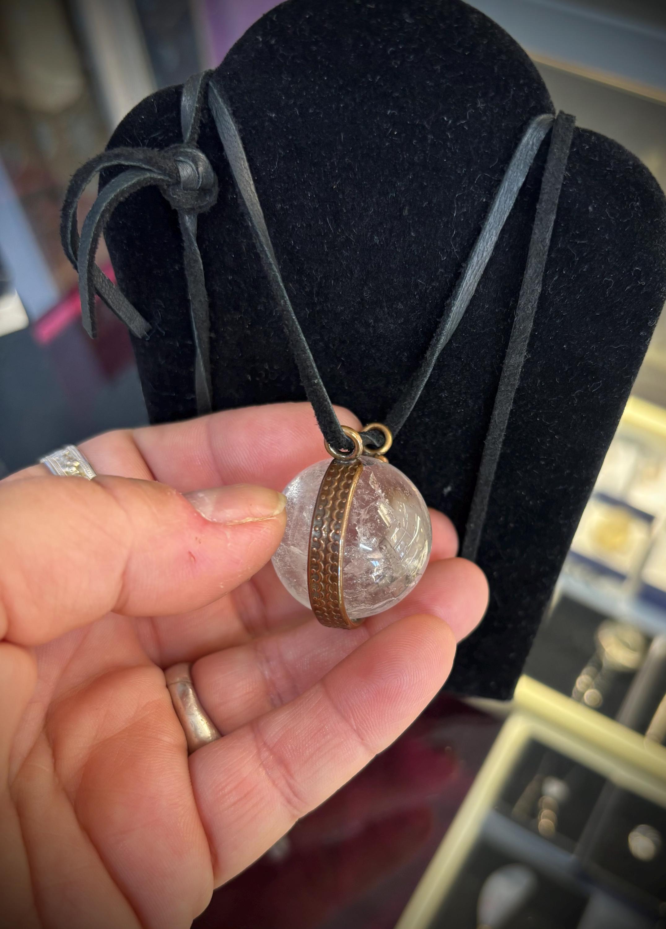 Handmade pendant is unique no two alike as these are natural rock crystal cut into spheres. Some are clear while others have lots of inclusions or “stuff” inside.