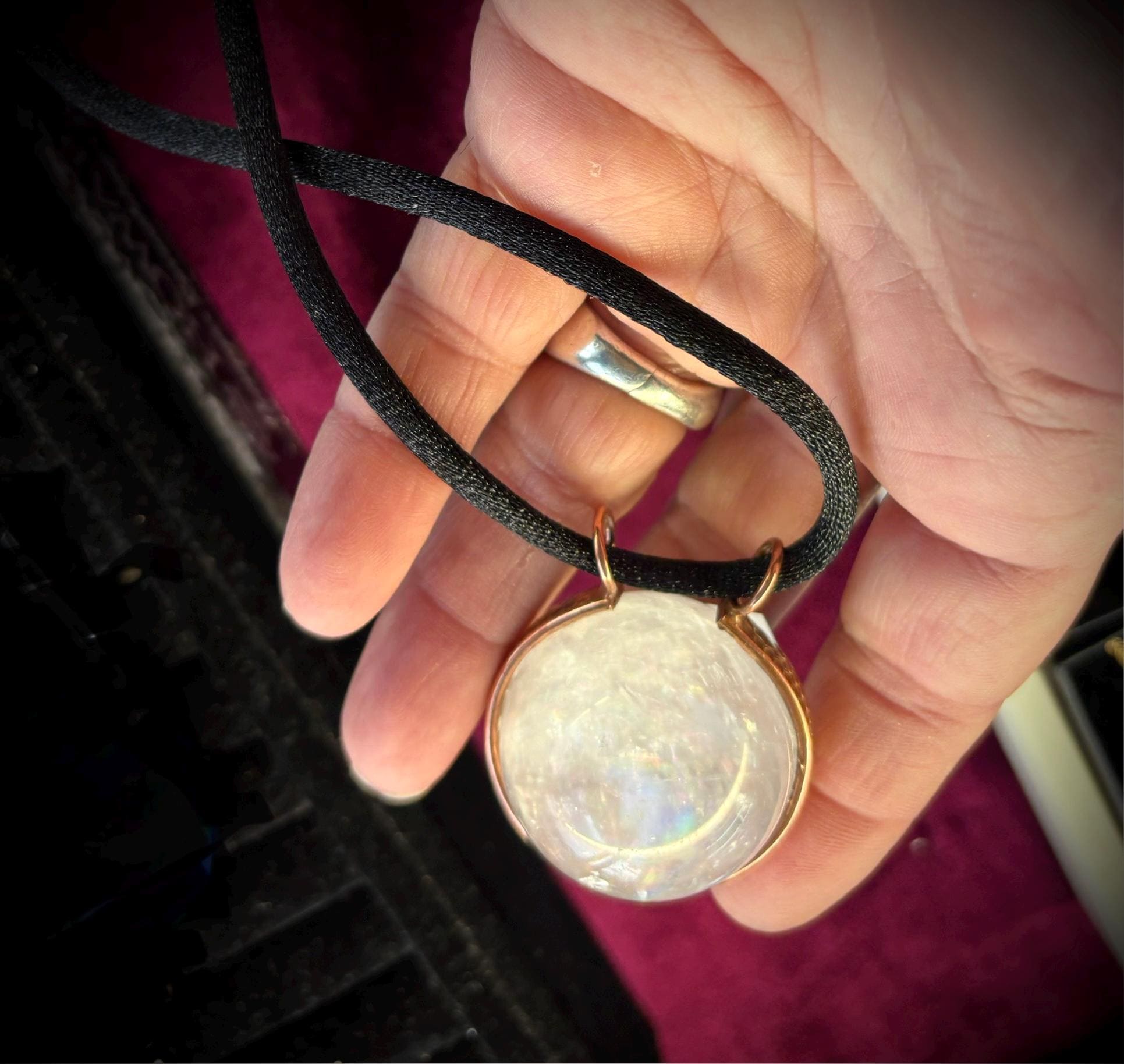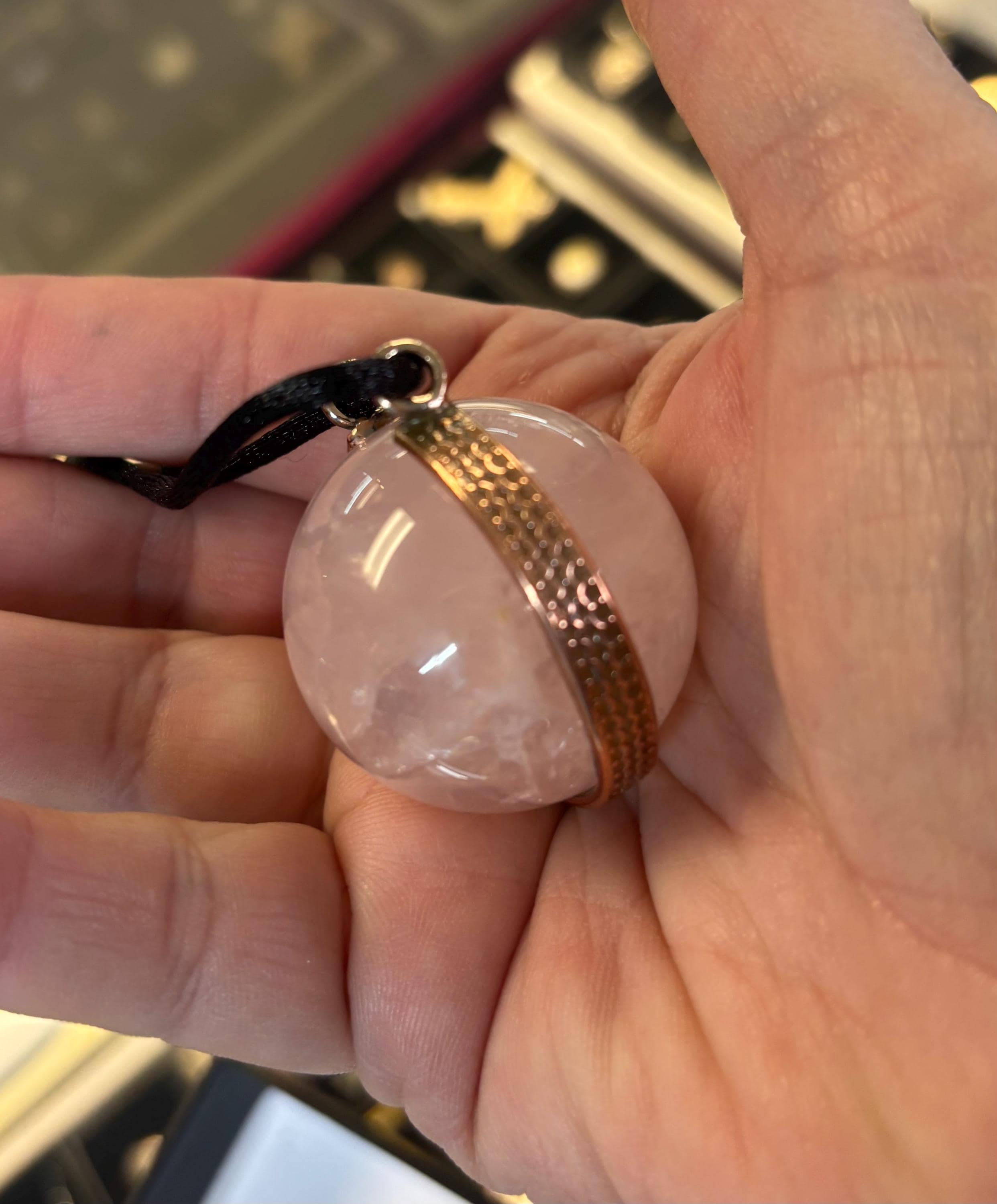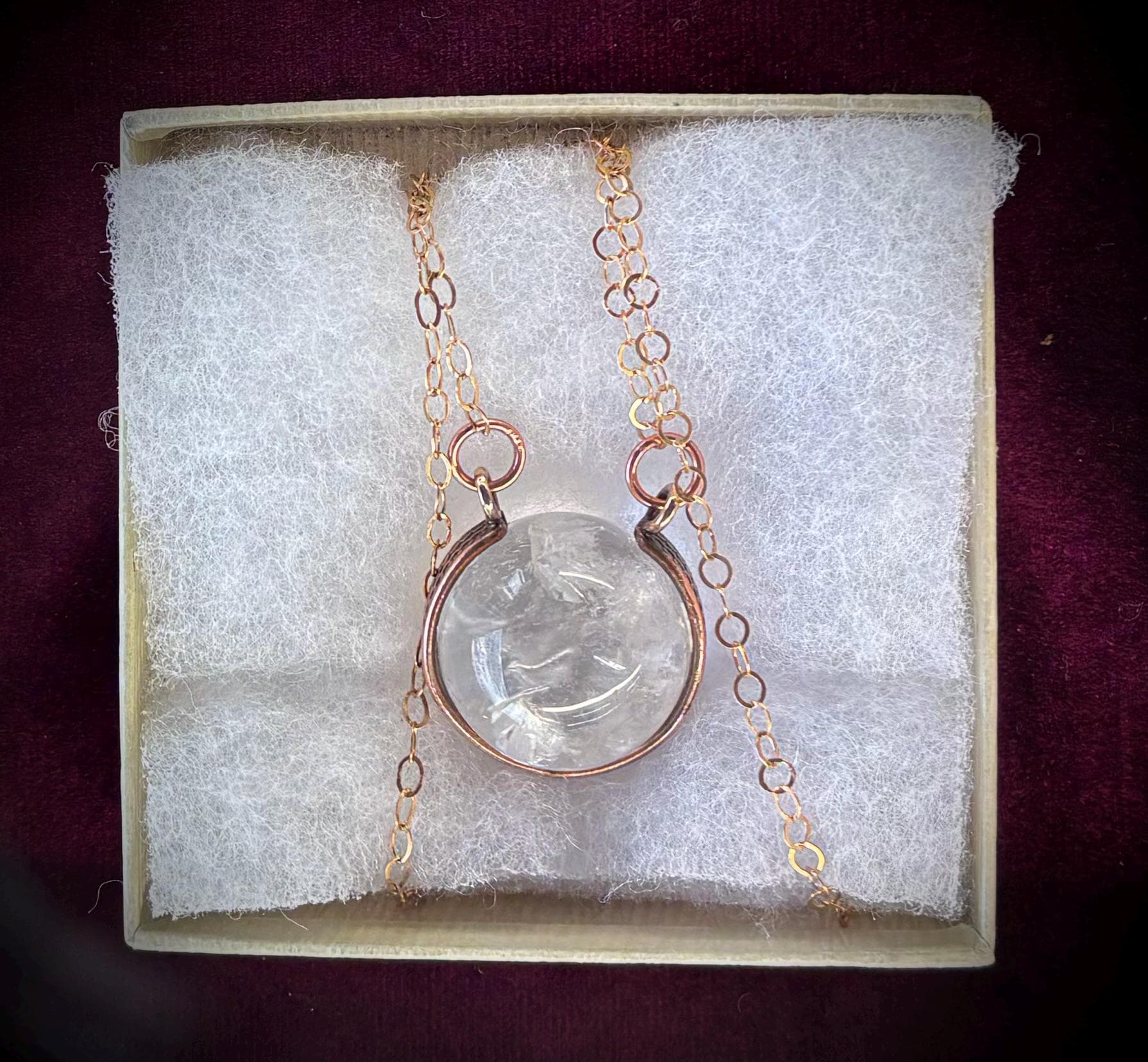Handmade pendant is unique no two alike as these are natural rock crystal cut into spheres. Some are clear while others have lots of inclusions or “stuff” inside.