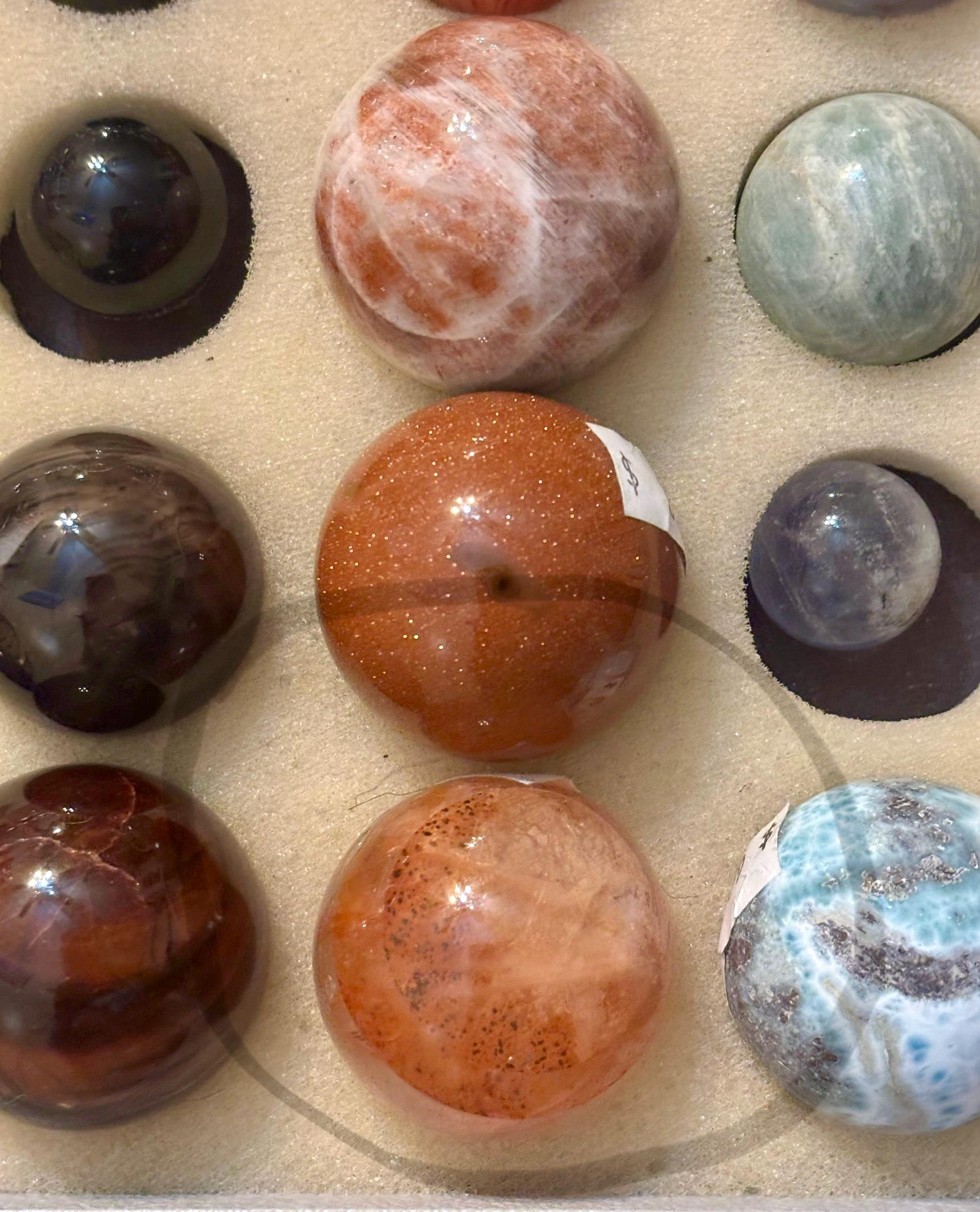 Here’s some that are available now: Clear quartz, Smokey Quartz,Sardonyx- Brown with orange striations, Black obsidian with golden sheen, even pyrite!