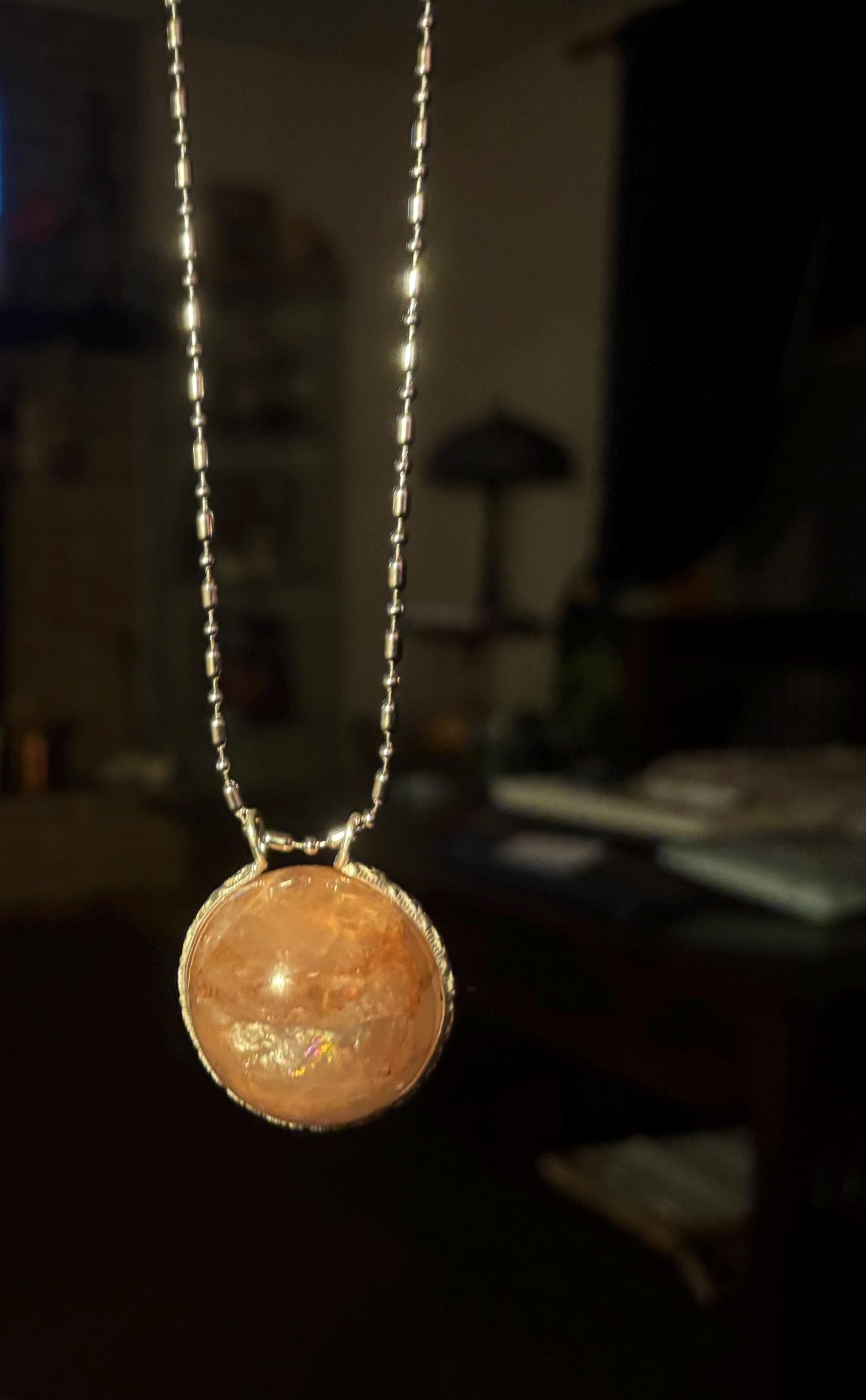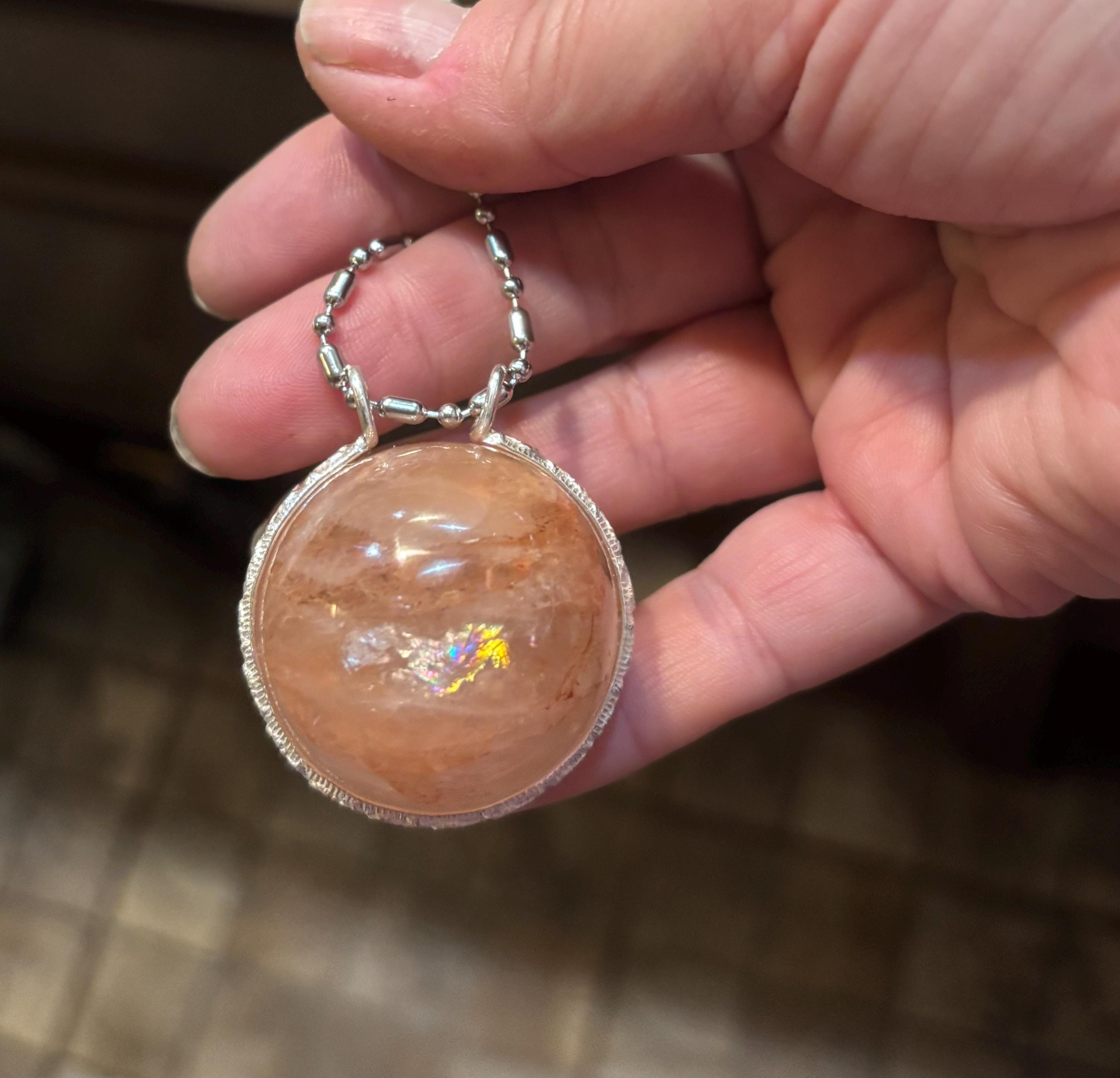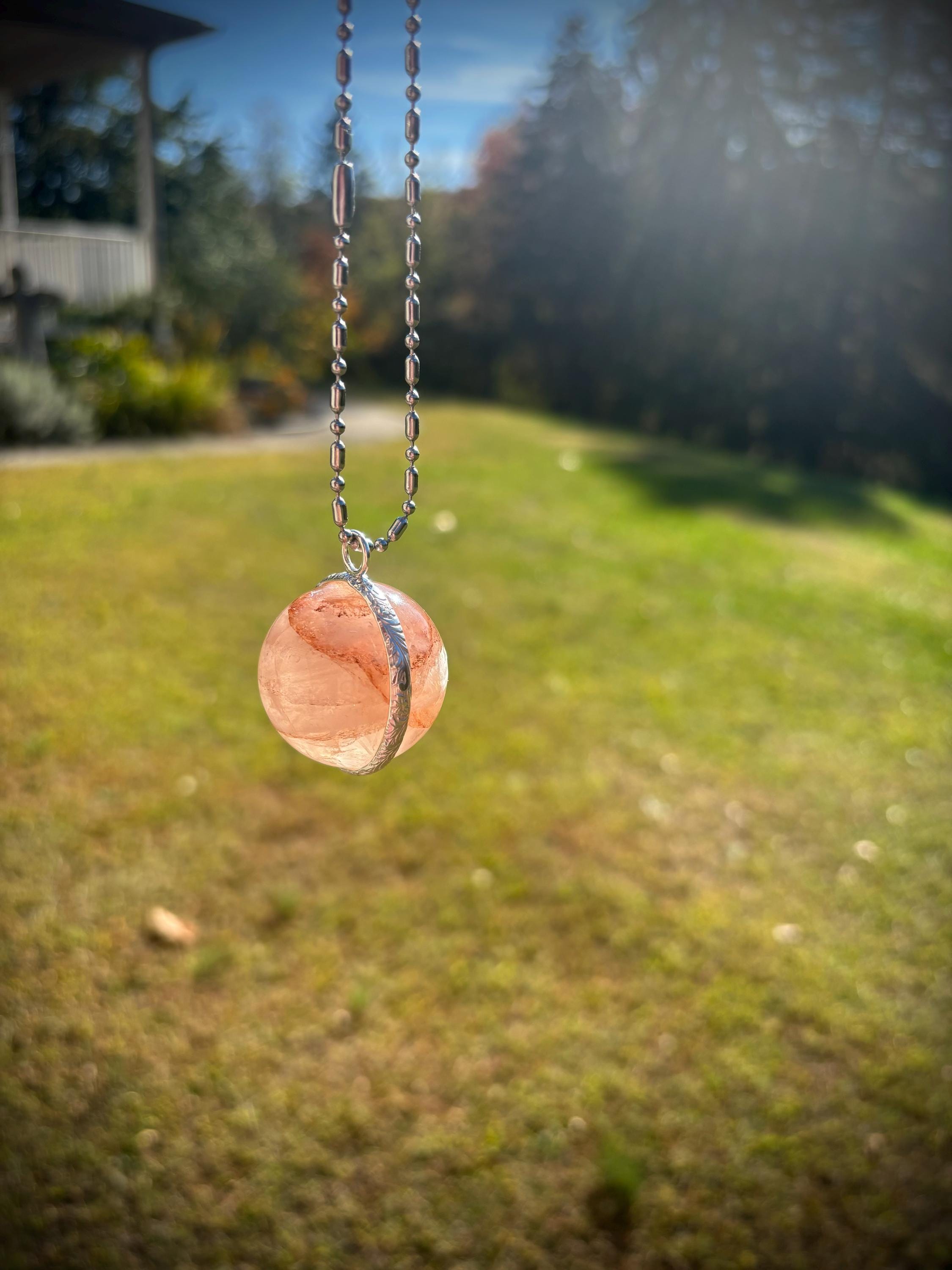 Fire Quartz / Hematoid Quartz Orb set in Sterling Silver Patterned bezel wire. Large Quartz Sphere Necklace some with a beautiful orange iridescence inside. Exact sphere you will receive is in lat photo circled.